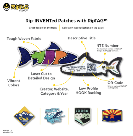 Our RipTAG™ designs are made of colorful fabrics woven together to show incredible detail. They will interchangeably attach to our RipHEAD™ caps and RipFISH™ backpacks.